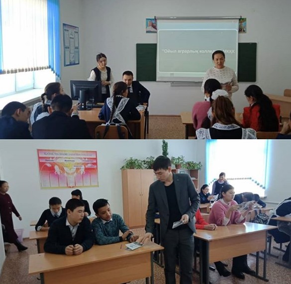 Ойыл аграрлық колледжі бойынша 2019-2020 оқу жылына арналган талапкерлерге кәсіптік бағдар беру жұмыстарының жұмыс жоспарына сәйкес, 31-қаңтар күні колледж оқытушылары Дусипова А, Нурмухамбетова А , Ағыбаев Н, Ертлеуов А Құмжарған орта мектебінің оқушыларымен кездесті. Кездесу барысында Ойыл аграрлық колледжінің тыныс тіршілігі, алдағы атқарылатын ауқымды жұмыстар айтылып, кәсіптік білім берудің негізгі мақсаттары түсіндірілді. Әр уақытта білікті, жауапкершілігі бар, өз мамандығын еркін меңгерген мамандандырылған қызметкерлер дайындаумен қатар болашақта әр бір жас кез келген бәсекеге қаблетті ерекше қасиеттерге ие болу керектігіне тоқталды.