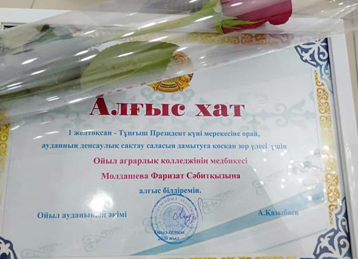 Осындай тақырыппен бүгін түстен кейін «Шұғыла» мәдениет және демалыс орталығында Қазақстан Республикасының Тұңғыш Президенті күніне арналған мерекелік шара өтті. Осы шара аясында колледж медбикесі Молдашева Фаризат Сәбитқызы аудан әкімінің алғыс хатымен марапатталды.