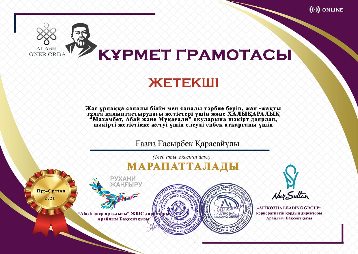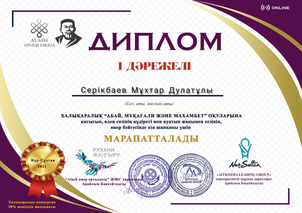 Халықаралық "Абай, Мұқағали және Махамбет"оқуларына Серікбаев Мұхтар Дулатұлы қатысып,1 дәрежелі Дипломмен марапатталды.Нұр-Сұлтан қаласында өтетін финалға 30% жеңілдікпен жолдама алды. Алар асуларың көп болсын!