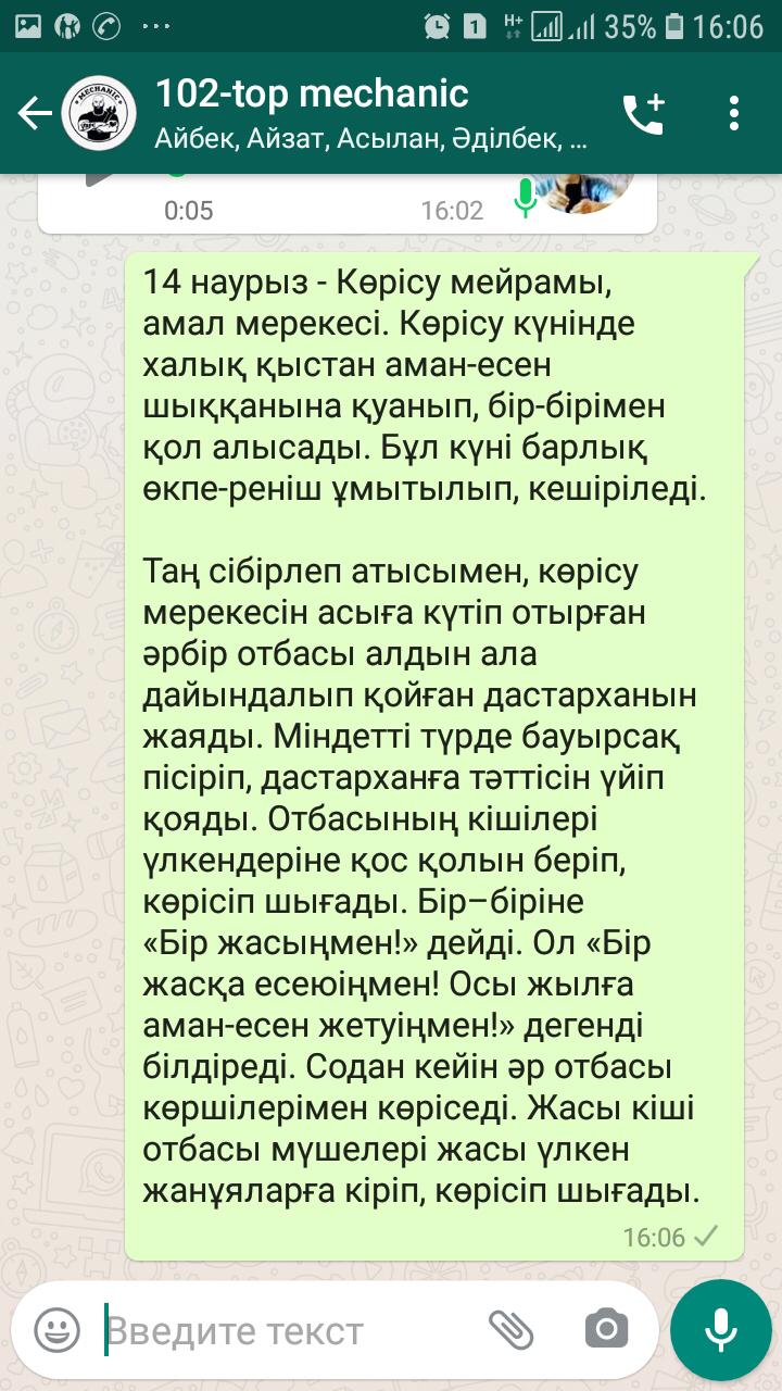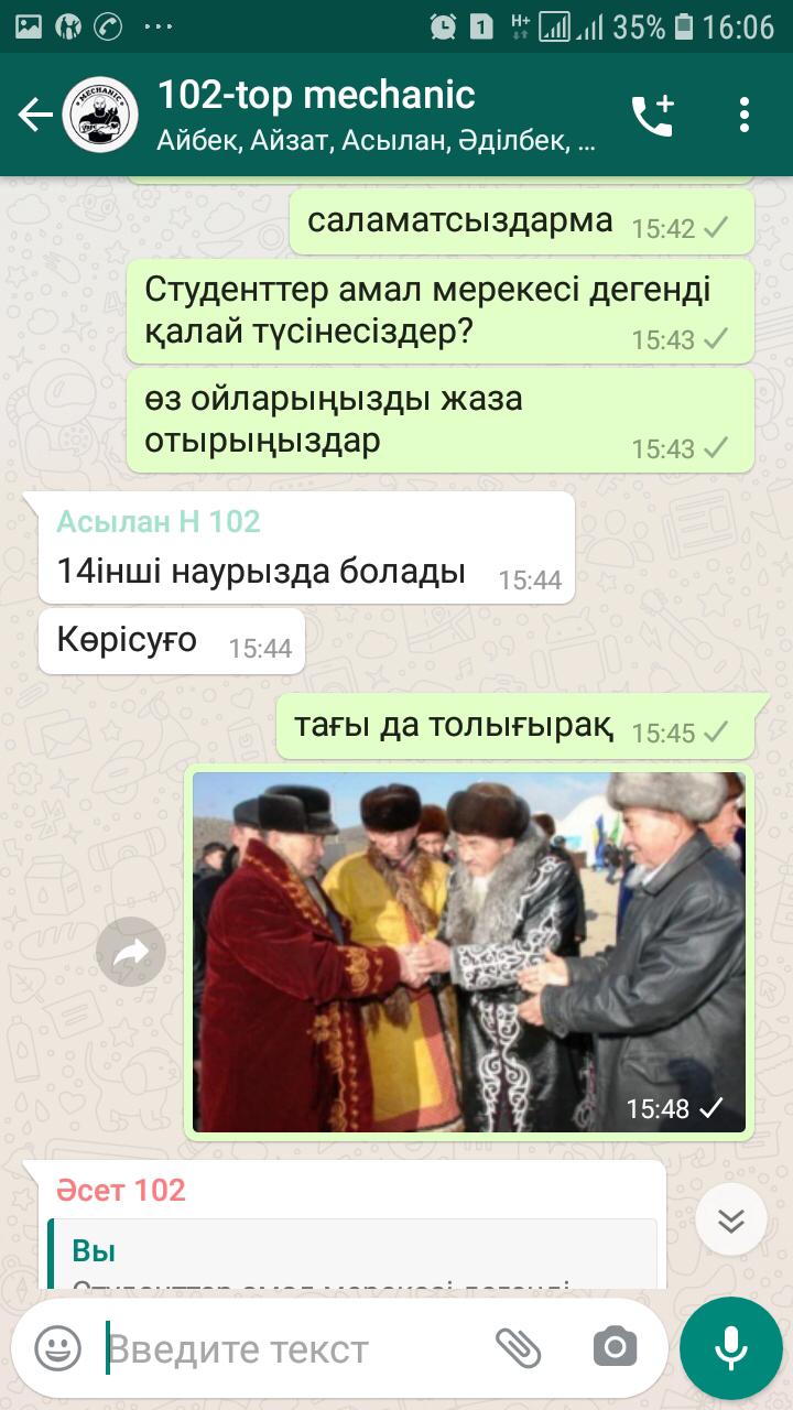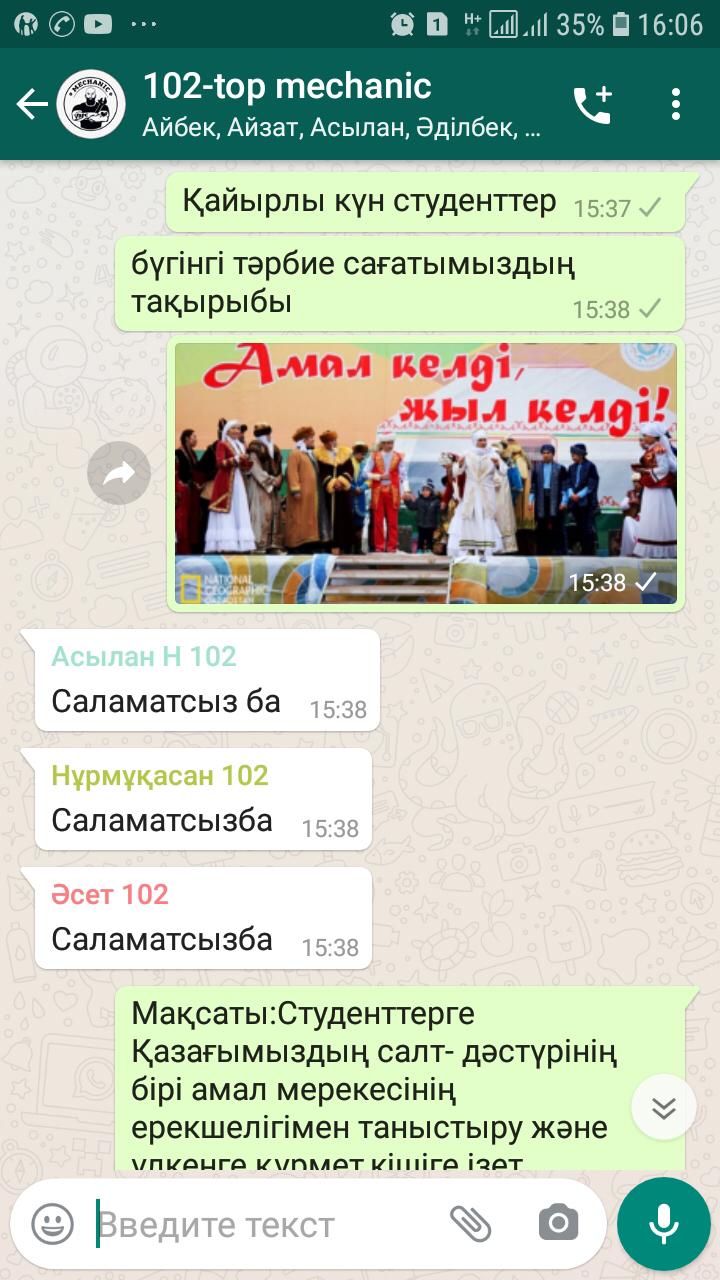 14-наурыз Амал мерекесіне орай 102 топ “Ауылшаруашылығын механикаландыру” мамандығына “Амал келді,жыл келді” тақырыбында онлайн тәрбие сағаты өтті.