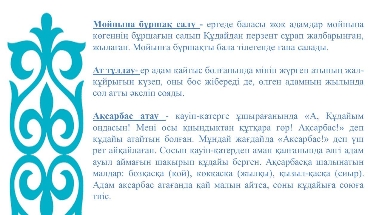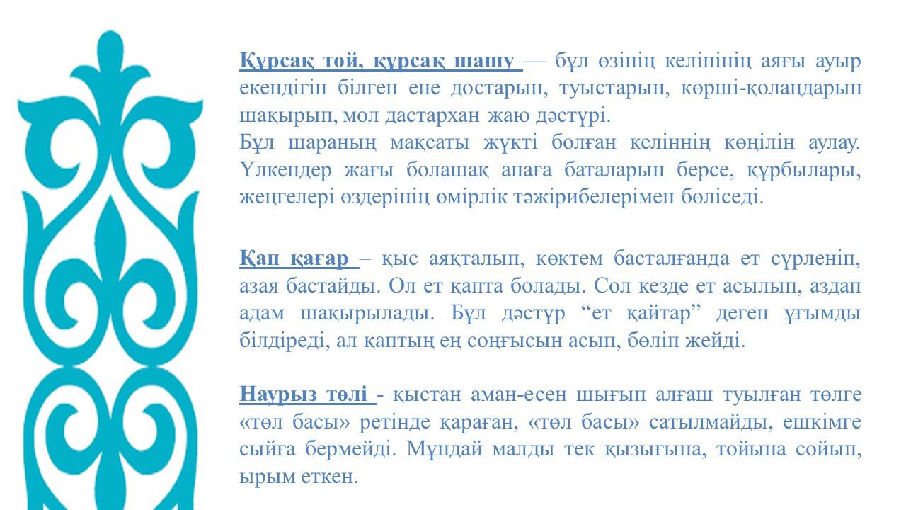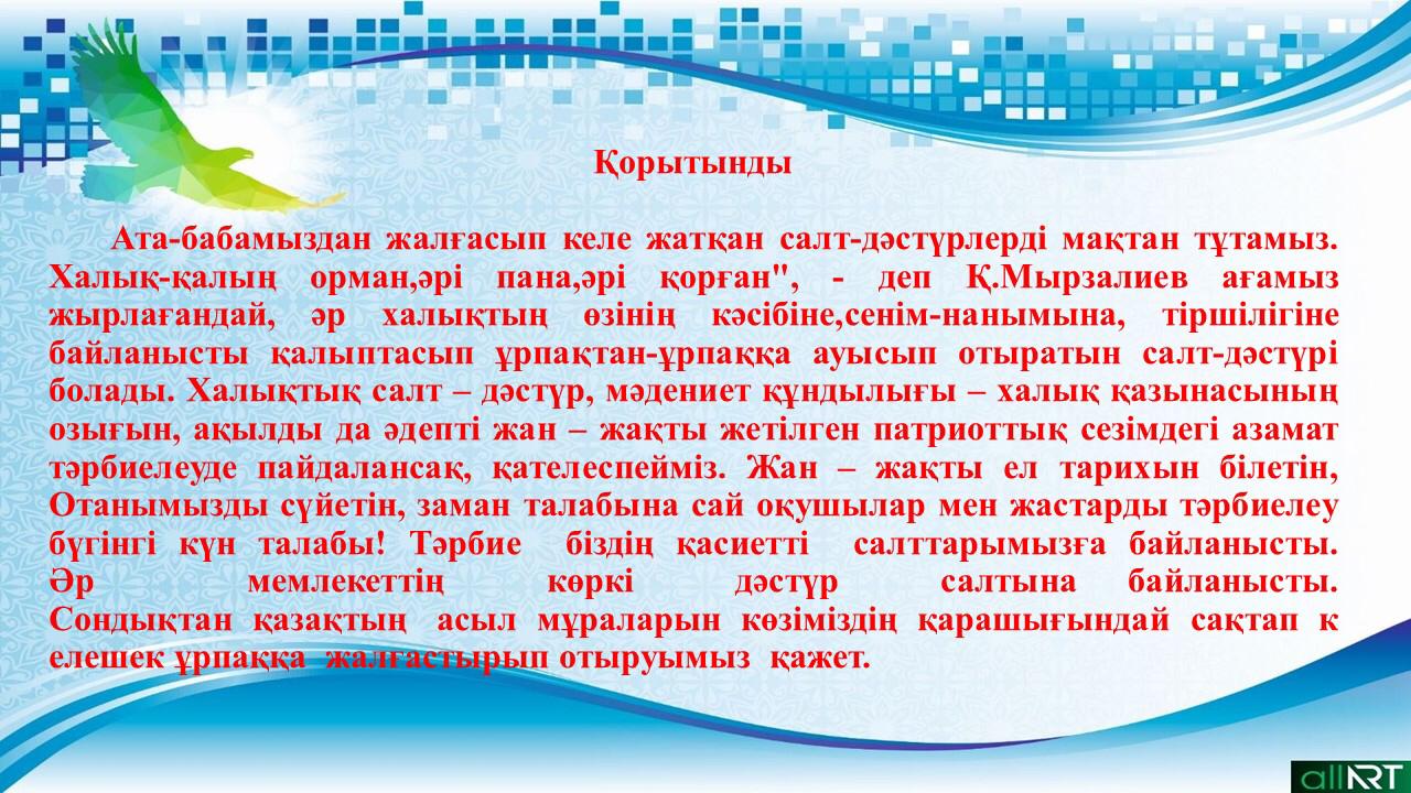 Салт-дәстүр - атадан қалған мұра. Елімізді, өз туған өлкемізді, салт-дәстүрімізді шын жүрекпен сүйеміз және әлемге танытқымыз келеді. Себебі қазағымыздың асыл қасиеттері жүрегімізге қуат, көңілімізге мақтаныш береді. Бүгінгі іс-шараның басты мақсаты студенттерді қазақ халқының қолданыстан шығып бара жатқан салт-дәстүрлерімен жақынырақ таныстырып, жоғалып бара жатқан салт- дәстүрлерді қайта жаңғырту болатын.