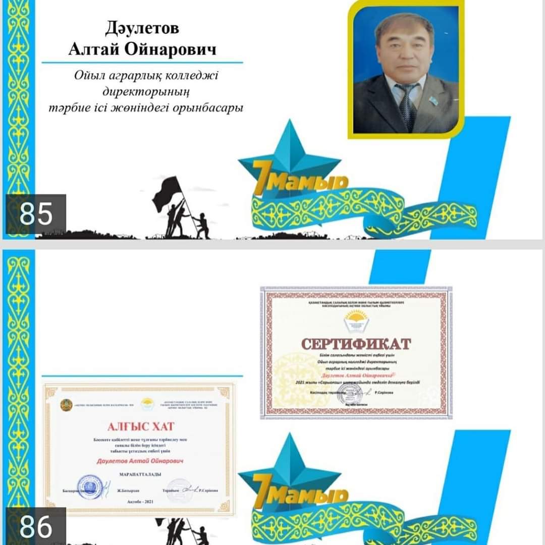 Ақтөбе облыстық білім және ғылым қызметкерлері кәсіподақ ұйымы 7 мамыр – Отан қорғаушылар күні мерекесіне орай Ауғанстанда интернационалдық борышын өтеген ардагерлер мен Семей ядролық сынақ полигонында әскери міндетін атқарған директордың тәрбие ісі жөніндегі орынбасары Дәулетов Алтай Ойнарұлы облыстық білім басқармасы мен білім кәсіподағының бірлескен алғыс хаты және «Сарығаш» емдеу-сауықтыру орталығына жолдама берілді.