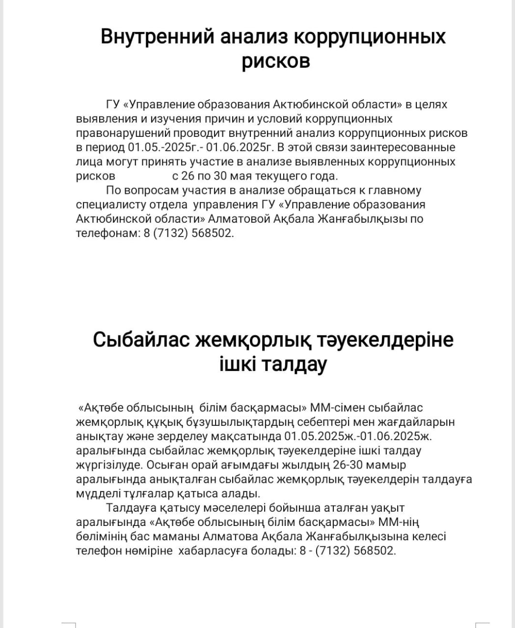 2 | Сыбайлас жемқорлық тәуекелдерін ішкі талдау қорытындылары бойынша анықтама; | DOCX |